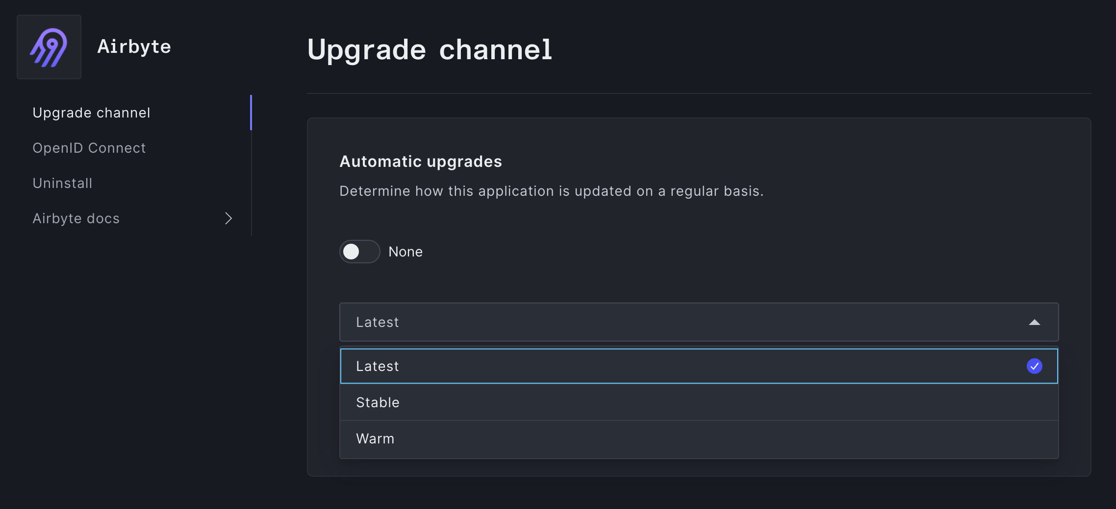 Updates to Plural applications are applied automatically based on a per-application setting. This setting supports telling Plural to only upgrade for Stable or Warm releases, as well as disabling automatic upgrades altogether. Here's what each of the settings mean: